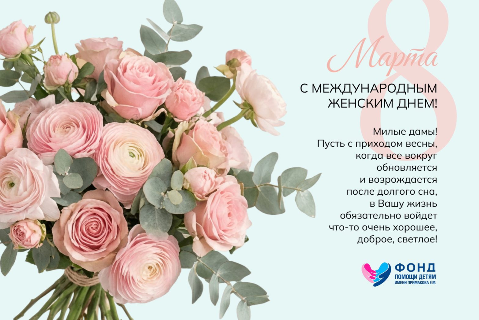 Милые дамы! Примите самые искренние поздравления с Международным женским днем от всего коллектива Благотворительного фонда имени Примакова Е.М. В этот день хочется пожелать, чтобы каждое мгновение вашей жизни было наполнено исключительно яркими красками, пропитано нежностью и овеяно теплом. Пусть каждый ваш шаг будет легким, а все мечты превращаются в реальность быстрее, чем тает мартовский снег!